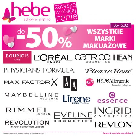 * The promotion is valid from 06-16.02.2020 or while stocks last. Promotional brands: Loreal Paris, Maybelline New York, Bourjois, Rimmel, Max Factor, Eveline Cosmetics, Physicians Formula, Revolution, Revlon, Pierre Rene, Lirene, Cashmere, Bell, Hean, Catrice, essence, Ingrid, AA)