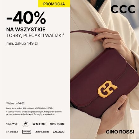 Nowa torebka? Plecak? Walizka? A może kosmetyczka, która zmieści wszystko to, co niezbędne? Teraz w CCC modele znanych marek kupisz 40% taniej! Zrób zakupy za minimum 149 zł i zyskaj rabat na wymarzone torebki, plecaki, walizki lub kosmetyczki! Superceny czekają w CCC!