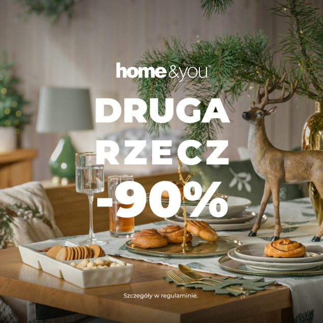 W salonach home&you trwa promocja DRUGA RZECZ -90%, a w niej m.in. pościele, zastawy, dekoracje świąteczne i wiele, wiele innych! A za każde wydane 100 zł zyskasz BON 150 zł na następne zakupy! Szczegóły w regulaminie i na home-you.com
