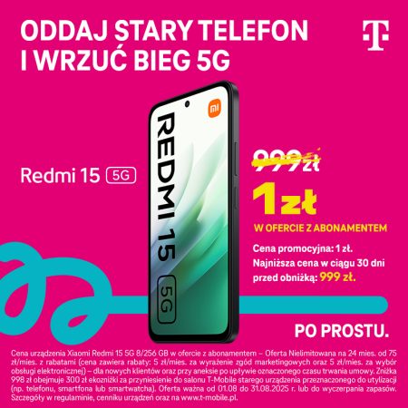 Xiaomi Redmi 15 5G 8/256 GB za 1 zł w ofercie z abonamentem – Oferta Nielimitowana na 24 mies. Zniżka 998 zł obejmuje 300 zł ekozniżki za przyniesienie do salonu T-Mobile starego urządzenia przeznaczonego do utylizacji (np. telefonu, smartfona lub smartwatcha). Oferta obowiązuje do 31.08.2025r. lub do wyczerpania zapasów. Zapraszamy do sklepu T-Mobile.